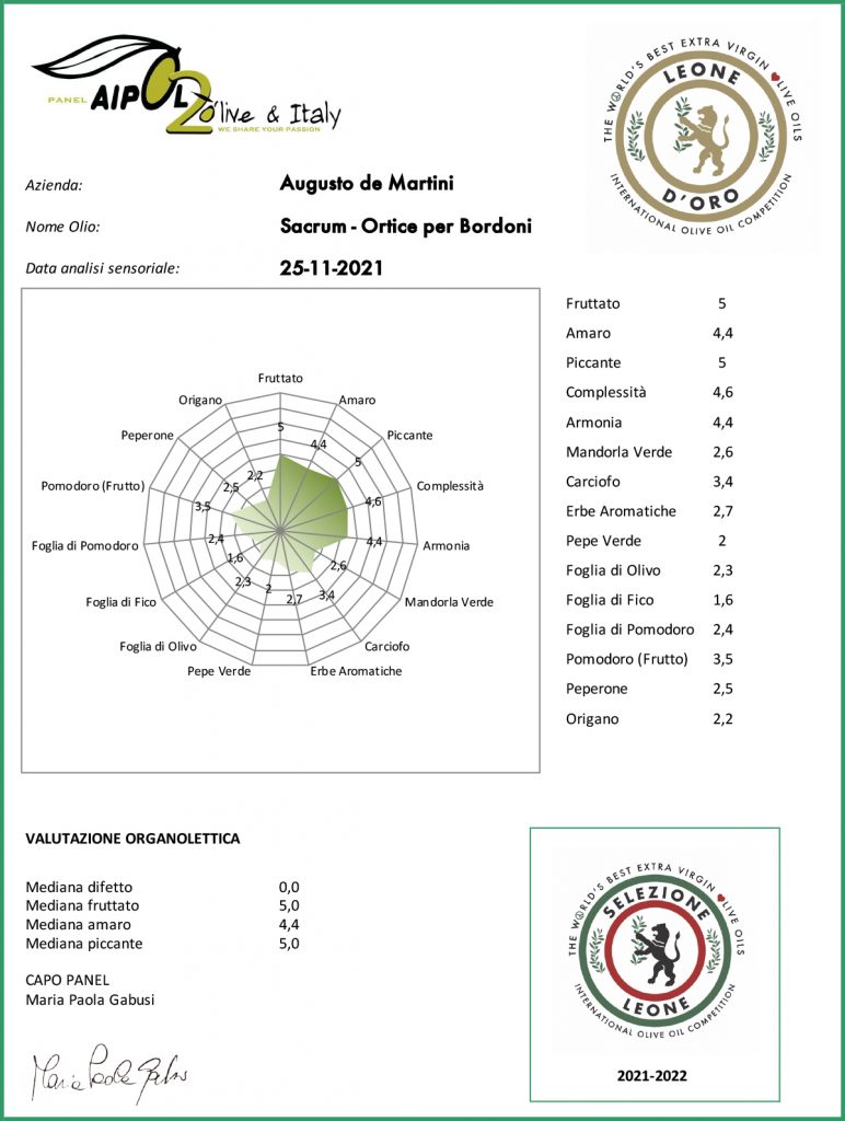 È un prodotto di alto pregio, contraddistinto da un alta percentuale di acido oleico e da un elevato contenuto di polifenoli. Fruttato verde erbaceo, si caratterizza per la presenza di chiare note verdi di foglia e frutto di pomodoro. All’assaggio si evidenziano profumi di erbe aromatiche, origano e cuore verde di carciofo che si sposano con un amaro e piccante medi, persistenti e equilibrati.Olio filtrato, per mantenere più a lungo le note verdi e fresche che lo contraddistinguono.