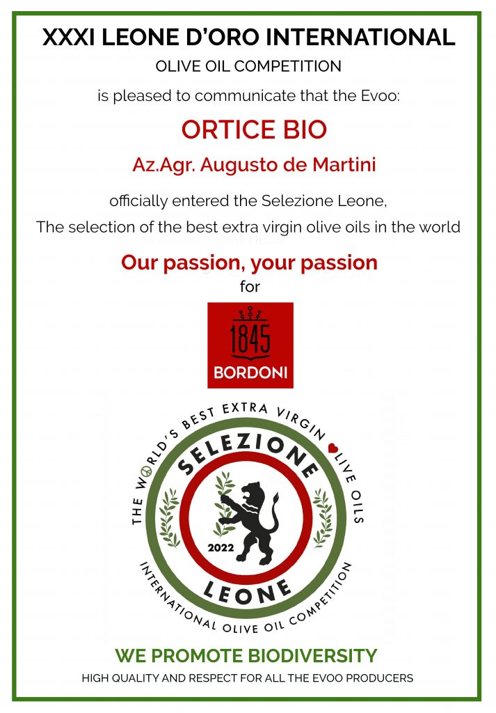 Olio Extra Vergine di Oliva Biologico prodotto con la varietà di Oliva Ortice, proviene dall’Azienda Agricola Augusto De Martini, Campania.