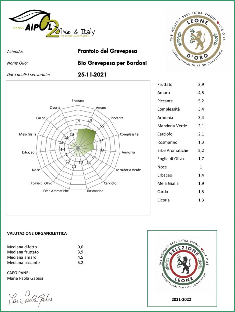 Ha un fruttato medio che si presenta all’olfatto con sentori di foglia d’ulivo, carciofo, mandorla amara, rucola e rosmarino. In bocca l’amaro e il piccante sono armonici e piacevoli. L’olio è filtrato per evitare difetti organolettici che potrebbero svilupparsi col tempo, per questo ha un’ottima durata nel tempo.